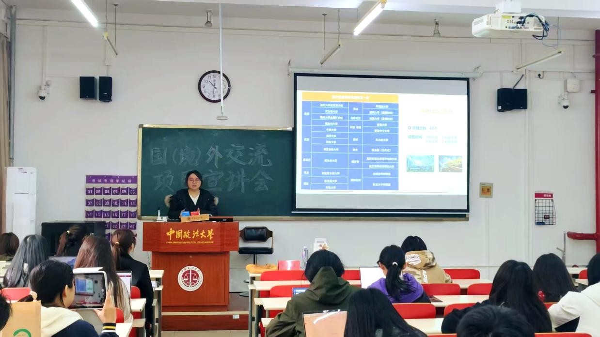 /涉外法治学院联合国际合作与交流处在昌平校区端升楼104举办赴国(境)外交流项目宣讲会。活动面向学校“涉外法治人才培养”战略需求,百余名本科、研究生现场参与。宣讲会由国际合作与交流处项目科科长张雨晨主讲。