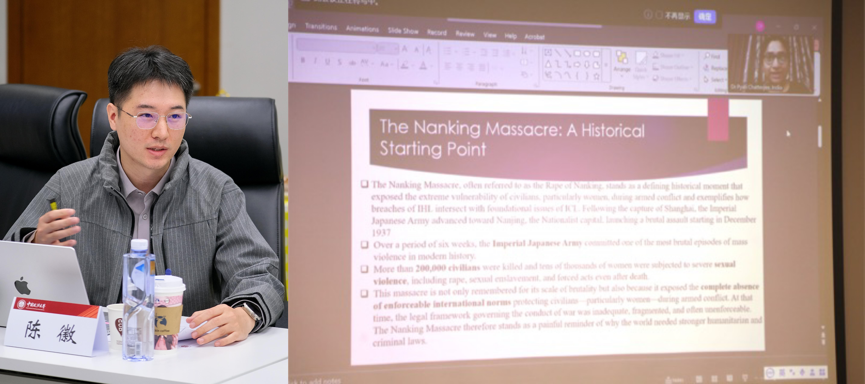 中国政法大学法学院冷新宇副教授首先探讨了“国际人道法的扩张解释和国际刑法的互动”,指出国际人道法的扩张解释趋势与国际刑法的罪刑法定原则之间存在张力,二者的适用边界与平衡路径需结合实践审慎协调;印度国防大学Varun V. M.助理教授随后聚焦“自主武器系统违反国际人道法”议题,深入分析以该类行为追究个人责任时,“间接正犯罪论”的适用可能;北京大学法学院林兆然博士后聚焦海战,既梳理了其历史发展与概念演变,也分析了《纽波特手册》对现代海上冲突规则体系构建的指导意义和实践影响;英国布里斯托大学硕士研究生Nguyen Thi Ngoc Mai则围绕国际刑事司法的实施维度,重新评估了联合国安理会在通过国际刑事司法机制执行国际人道法过程中的实际效能。